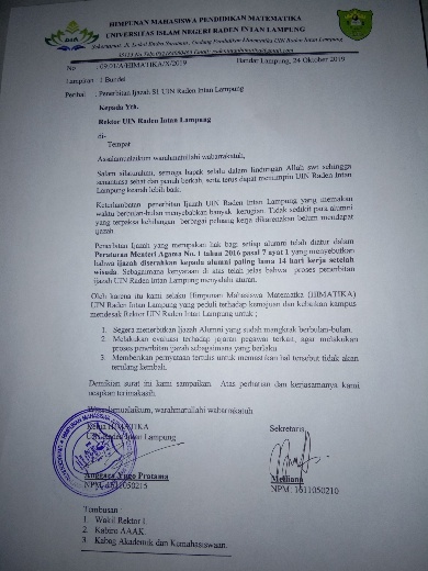 Akibat kelalaian pihak kampus tersebut, akhirnya memantik ratusan alumni untuk merapatkan barisan dan bergabung dalam Himpunan Mahasiswa Pendidikan Matematika (HIMATIKA), melayangkan surat tuntutan resmi kepada pihak kampus UIN Raden Intan Lampung.