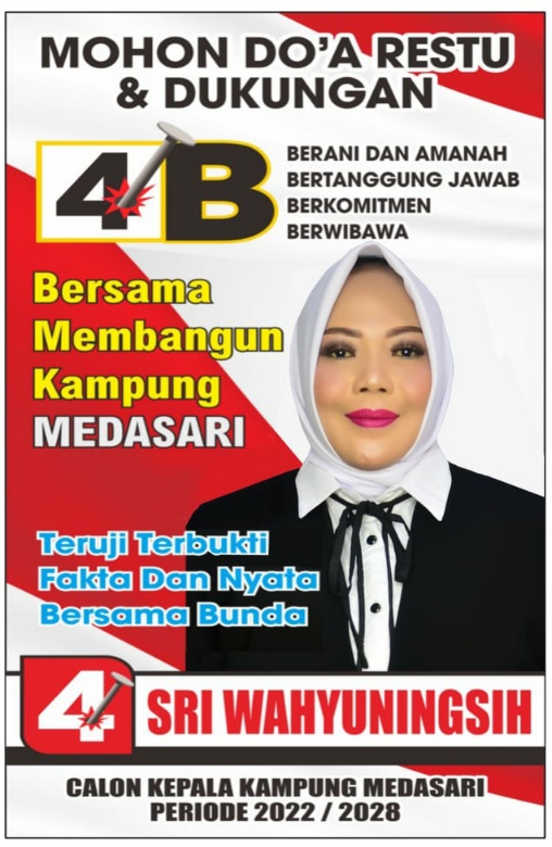 Dengan nomor urut 04 (empat) dalam Pemilihan Kepala Kampung (Pilkakam), Sri Wahyuningsi selaku kaum hawa, memberanikan diri untuk mengemban amanah, bertanggung jawab, berkomitmen serta berwibawa. Dan teruji, terbukti, fakta dan nyata bersama bunda.