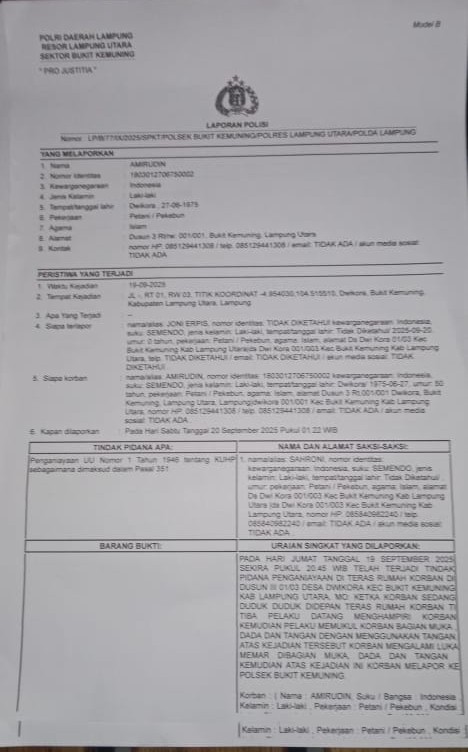 Laporan itu tertuang dalam surat Nomor : LP/B/77/IX/2025/SPKT/POLSEK BUKIT KEMUNING/POLRES LAMPUNG UTARA/POLDA LAMPUNG.