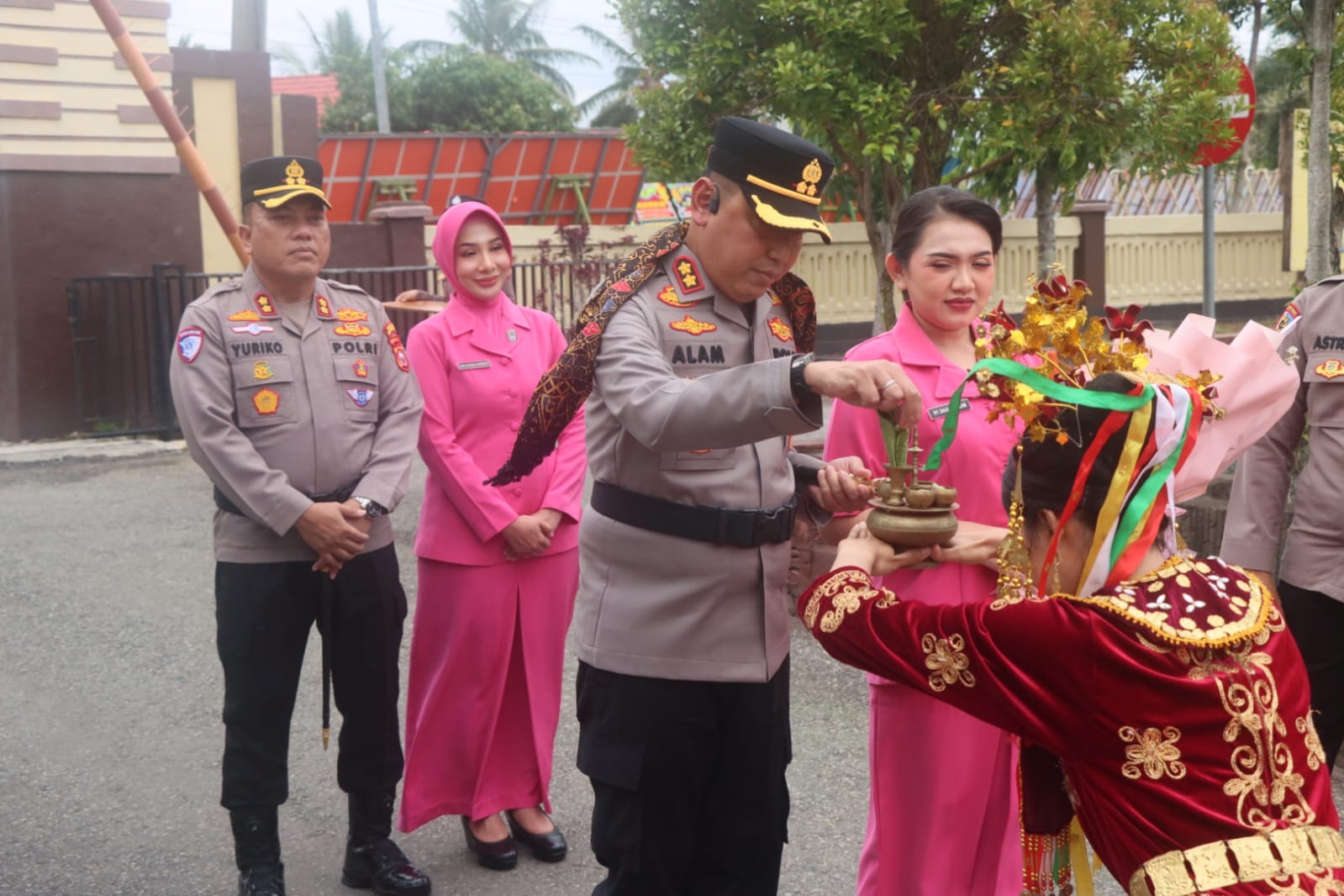 Prosesi penyambutan ditandai dengan tradisi pedang pora sebagai simbol kehormatan dan penerimaan resmi kepada AKBP Alam Bawono sebagai Kapolres Kaur yang baru.