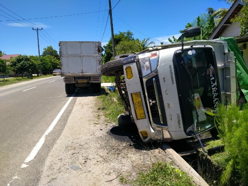 Rencananya, lanjut Hendri, truk yang membawa 11 ton beras itu akan membongkar muatannya di Pekan Way Napal. Nahasnya karena sopir mengantuk mobil masuk selokan dan langsung terbalik. (Gus)