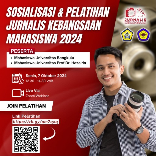 Kini tiba saatnya giliran Provinsi Bengkulu, dengan 2 perguruan tinggi kebanggaannya negeri dan swasta, sebagai representasi dari perguruan tinggi lainnya. Universitas Bengkulu (Unib) dan Universitas Hazairin (Unihaz), sebagai kampus negeri dan swasta, yang akan ikut meramaikan kompetisi Jurnalis Kebangsaan Mahasiswa BNPT tahun 2024 ini, yang akan dimulai hari Senin tanggal 7 Oktober yang akan datang.
