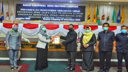 KIPRAH.CO.ID– Wakil Gubernur Lampung Chusnunia, menghadiri rapat Paripurna DPRD Provinsi Lampung tentang Penyampaian Kebijakan Umum Perubahan APBD (KUPA) dan Prioritas Plafon Anggaran Sementara (PPAS) Perubahan APBD Provinsi Lampung Tahun 2020, di Ruang Sidang DPRD Provinsi Lampung, Rabu (16/9/2020).
