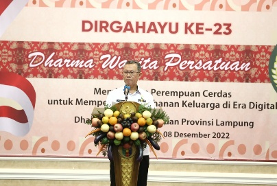 KIPRAH.CO.ID– Gubernur Lampung Arinal Djunaidi, diwakili Sekdaprov Lampung Fahrizal Darminto, menghadiri Peringatan Hari Ulang Tahun (HUT) ke-23 Dharma Wanita Persatuan (DWP) Tahun 2022 di Balai Keratun Lt.III, Kamis (08/12/2022).
