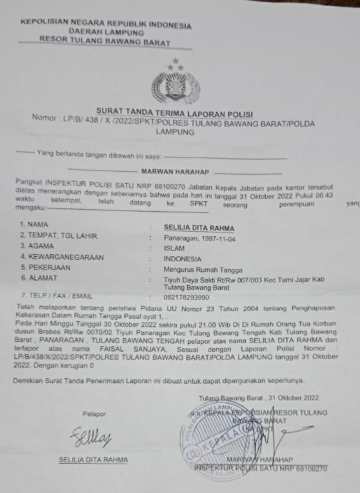 Korban menyatakan perbuatan sang suaminya dirinya mengalami memar dan luka di kepala, sehingga korban didampingi pihak keluarga melaporkan kejadian tersebut ke Polres Tubaba pada (31/10/2022) pukul 01.00 Wib. Dengan Laporan Polisi Nomor : LP / B / 438 / X / 2022 / SPKT / POLRES TULANG BAWANG BARAT / POLDA LAMPUNG.