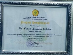 Sementara, piagam penghargaan tersebut diserahkan langsung Direktur Jenderal Perkebunan, Kementerian Pertanian RI, Dr. Ir. Kasdi Subagyono, M.Sc kepada Plt Kepala Dinas Tanaman Pangan Holtikultura dan Perkebunan (DTPHP) Kabupaten Lampung Selatan Ir. Noviar Akmal.