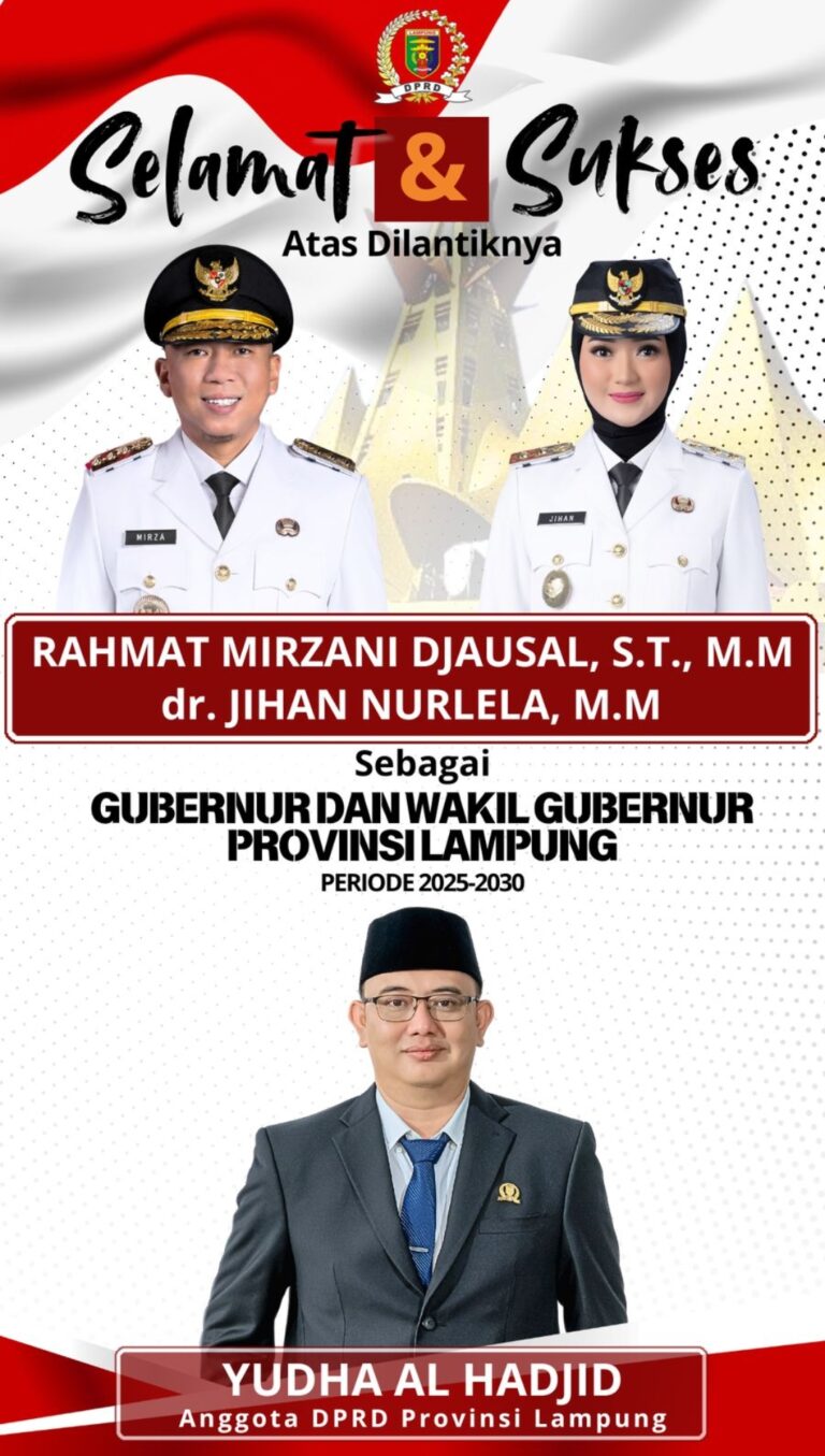 Bandar Lampung — Anggota Komisi III DPRD Provinsi Lampung, Yudha Alhadjid ucapkan selamat atas dilantiknya, Gubernur – Wakil Gubernur Lampung Periode 2025 – 2030, Rahmat Mirzani Djausal – Jihan Nurlela. Hal itu sampaikan, usai menghadiri serah Terima jabatan di Jakarta. Kamis (20/02/2025).